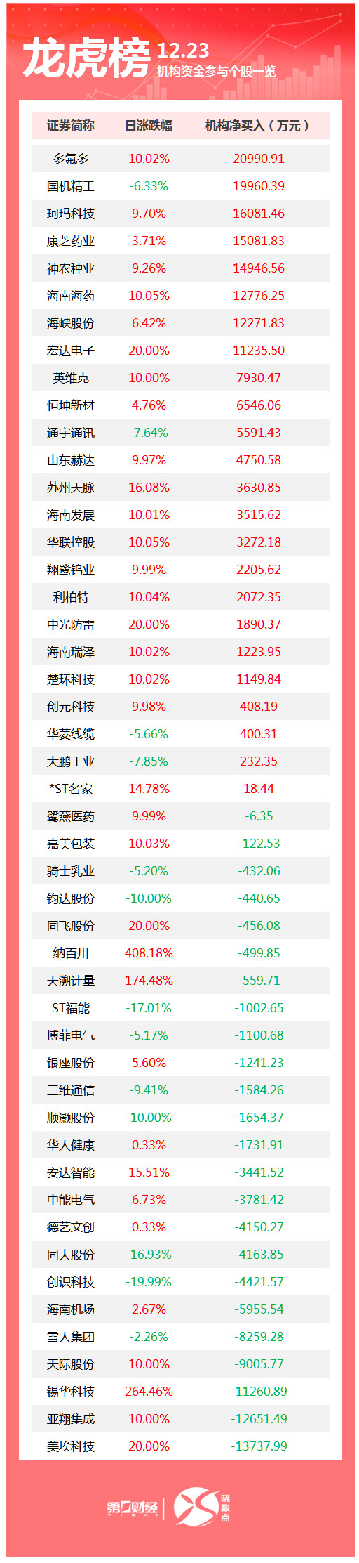 盘后数据显示,12月23日龙虎榜中,共48只个股出现了机构的身影,有24只股票呈现机构净买入,24只股票呈现机构净卖出。